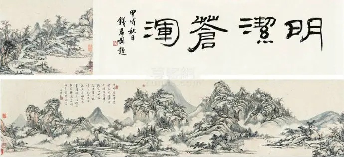 题跋:西庐师法大痴,大痴又追踪董巨。此幅浅绛色,山多矾头,笔势雄伟,真能写大痴阃奥,尝见石谷墓富春山图,用笔正同渊源相证,堪资探索,己丑除日取旧藏画卷供养先名宦公男黄彭年谨记。钤印:彭年。