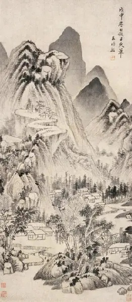 好友 王时敏的此幅《苍严遇雨图》作于庚戌年(1670年),时年七十九岁,是他晚年的画笔。画的右上角王时敏自题诗:
