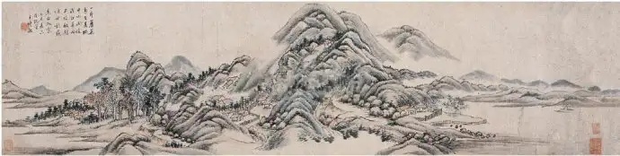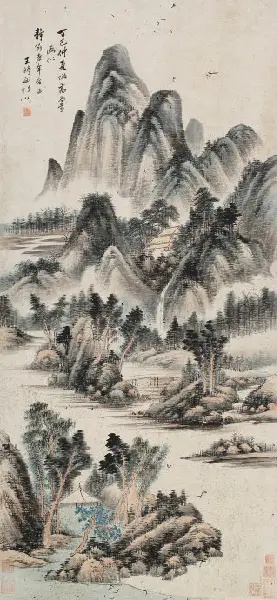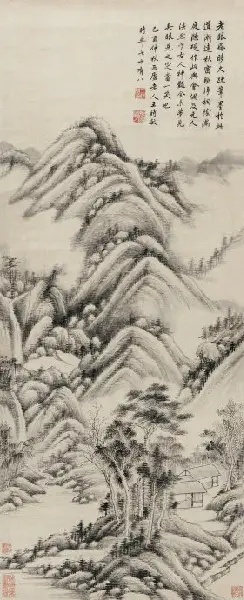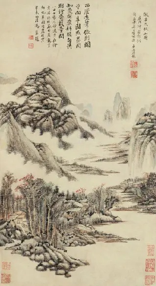 王时敏承董其昌衣钵,其画宗“南宗”一派,主要是继承元四家,尤其是黄公望。他对黄公望的墓习,用心之专,用功之勤,用力之深,临仿之多,达到了痴迷的地步,人谓之“专师黄痴,通体得气韵冲夷之妙”。是作虽为仿古作品,实出己意。前景水流坡岸,中景山峦绵延,林木与屋舍穿插其中,错落有致;通幅山体以赭石着色,淡墨点缀其间;在笔法上以披麻皴为主,另施以横点。王时敏在此作中还融入米氏云山画法,烟雾弥漫在山腰处,形成缥缈之感。全作笔墨丰富,设色清丽,布局开朗疏阔。