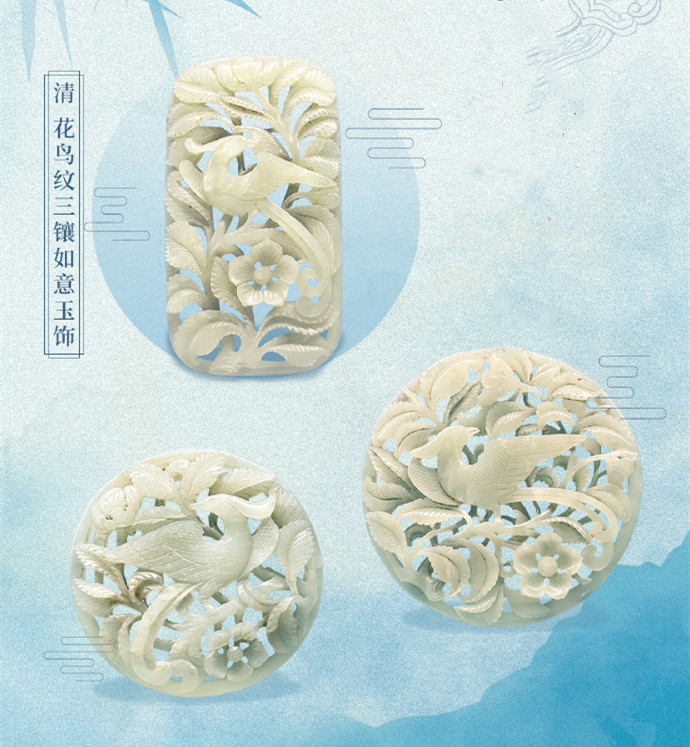 清代花鸟纹三镶如意玉饰,天津博物馆藏。