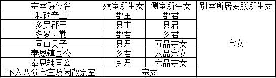 从这个表格中您可以看到,在清代可以得到爵位的宗女,只有皇帝的女儿以及宗室王公中入八分爵位者嫡室和侧室所生的女儿,其余的均是没有爵位和品级的“宗女”。
