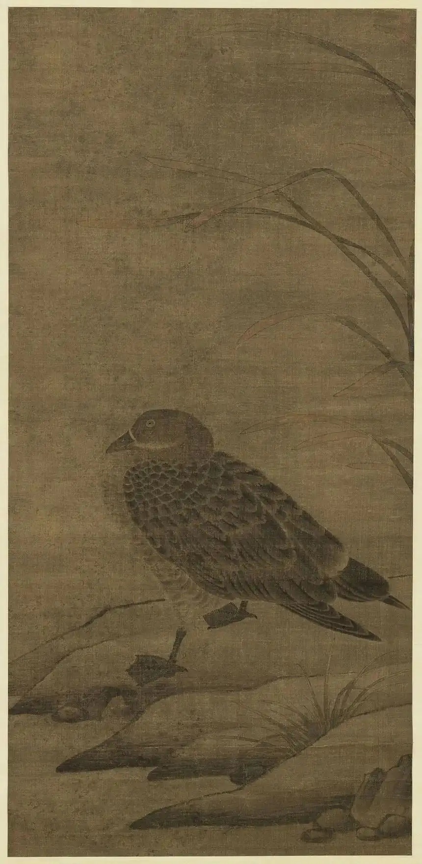 《芦雁图》水滨芦丛下,有只孤雁徘徊停留着。雁先以浓淡墨双钩成轮廓,然后用水墨渍染,再填以赭色和花青,表现出毛羽丰润的光泽。绢地染上淡墨,使背景趋于明显,并有寒气笼罩的感觉。