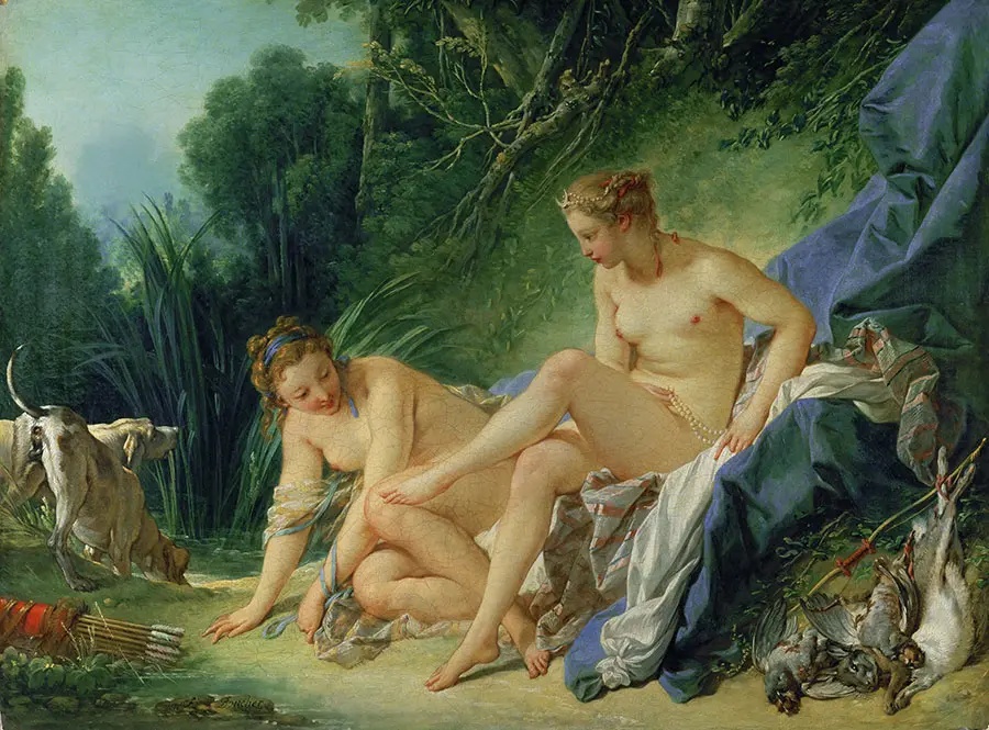 图中这件《浴后的狄安娜》是布歇表现女人体的作品中最好的一幅。它的技法的确是法国绘画的骄傲。整幅作品可以看出布歇早年工作的影响,他曾作过舞台的装饰布景师。当时的歌舞剧都喜欢表现爱情这类主题。布歇让一束明亮而带有暖色调的光打在画面中心的两个裸女身上,而背景是浓密的景物。或许有观众觉得那蓝色的丝绸出现在这种环境中实在有些奇怪,但这就像从前在照相馆里衬着假布景照相一样,都是创作者有意安排的。在它的对比与映衬下,女子的肌肤给人以红润、细腻的感觉。狄安娜即是希腊神话中的阿耳忒弥斯,她是月神和狩猎女神,是最高神祗宙斯的女儿,也是太阳神阿波罗的孪生姐妹。尽管青春漂亮,但她却以贞洁著称,终日不近俗尘,只是带着弓箭与猎犬在森林里游荡。据说有一次,一位猎人偷看到她在洗澡,狄安娜便愤怒地将他变成一头鹿,让猎狗吞噬。这一美丽又具有野性的女性形象在热衷狩猎的法国宫廷备受喜爱,在枫丹白露画派流行的时候,就有不少描绘她的成功作品。在布歇的画中,狄安娜侧坐在铺着白色和条纹格的丝绸上,前额戴着银色的月牙。她的脚尖搭在侍女的腿上,令人产生触觉上的联想。除了旁边的弓箭、猎犬与猎物,我们丝毫感觉不到她猎人般的敏锐与矫健,她更像是一个正在池边洗浴的美貌女子,坐在那里供人观赏。