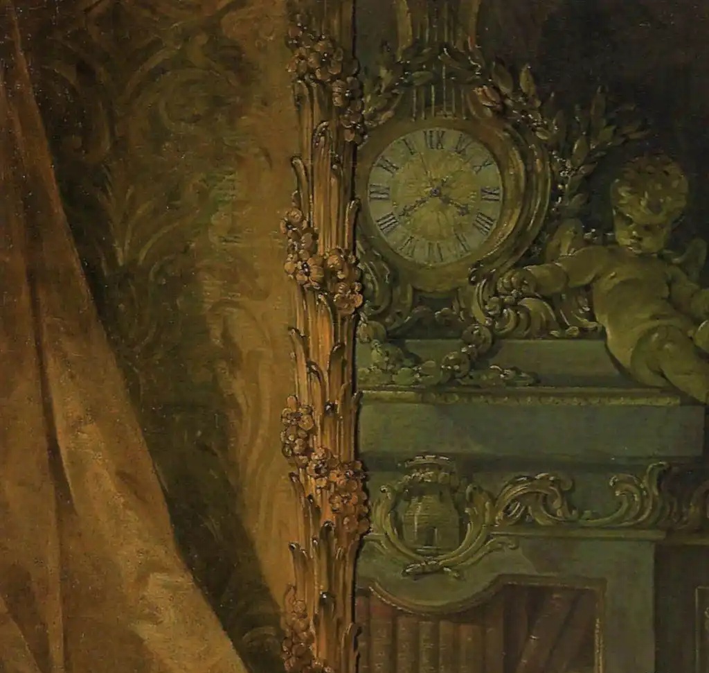 右手拿着一本摊开的诗集,小桌和地上也堆着书籍,表达蓬巴杜夫人美貌与学识并存。