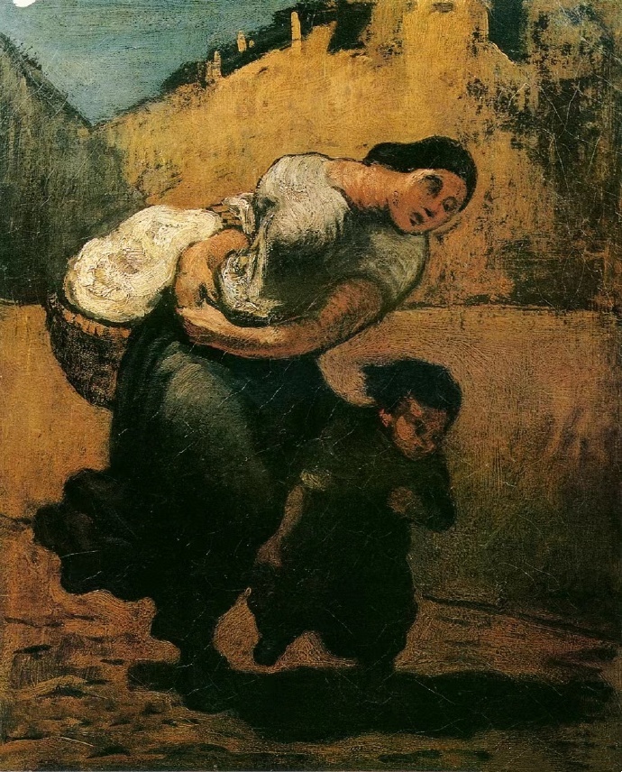 杜米埃最熟悉也最关心社会底层劳苦大众的生活和疾苦,杜米埃著名油画作品《带孩子的洗衣妇》中描绘了一个极为平凡的生活场面--母亲带着孩子洗衣服。画家运用激荡坚实的笔触和沉稳厚重的色块、粗犷的线条,塑造了为生活而奔波的母与子。母亲挎着一篮子洗好的衣服,带着一个不能离开她的孩子,急速地奔跑着,画家并不着力刻画人物的面部表情,而着意在人物奔走的动势所体现的内在精神。
