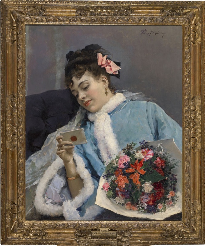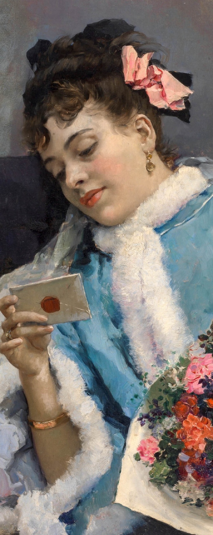Raimundo de Madrazo y Garreta雷蒙多·德·马德拉索·加雷特(1841.7.24—1920.9.15),一位来自马德拉索家族的画家,出生于意大利罗马,后定居西班牙马德里。作为西班牙现实主义画家,他主要以肖像画闻名,是杰出的沙龙风格肖像画家,后来的作品显示出洛可可风格和日本的影响。他在1800年左右创作了《情书》这幅画作,以艾琳·马森为模特,具有现实主义的风格。画中的艾琳·马森右手拿着新收到的一封还未来得及拆开的信,左手拿着一束鲜花,所穿的蓝色棉袍配以棉质白边,看着既保暖,又给画面增添了与主题相称的温馨感,还巧妙地衬托出她年轻而白皙细腻的肌肤。