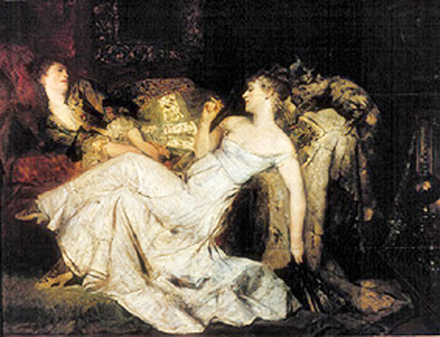 奥地利学院派历史画家马卡特以“唯美主义”享誉于世,被称为“色彩的魔法师”,他是1870年维也纳艺术世界的主导力量。他所绘制的上流社会女士的肖像有一种优雅的肉欲感,而他的神话题材绘画则更加情色化。克利姆特对他崇拜有加。这幅画描绘了两位没精打采的蛇蝎美人——她们的奢侈生活与辛勤劳动和诚实努力八竿子打不着关系,理解作品的关键在于那只栖息在金发女子脑后枕头上的充满凶兆的肥猫。