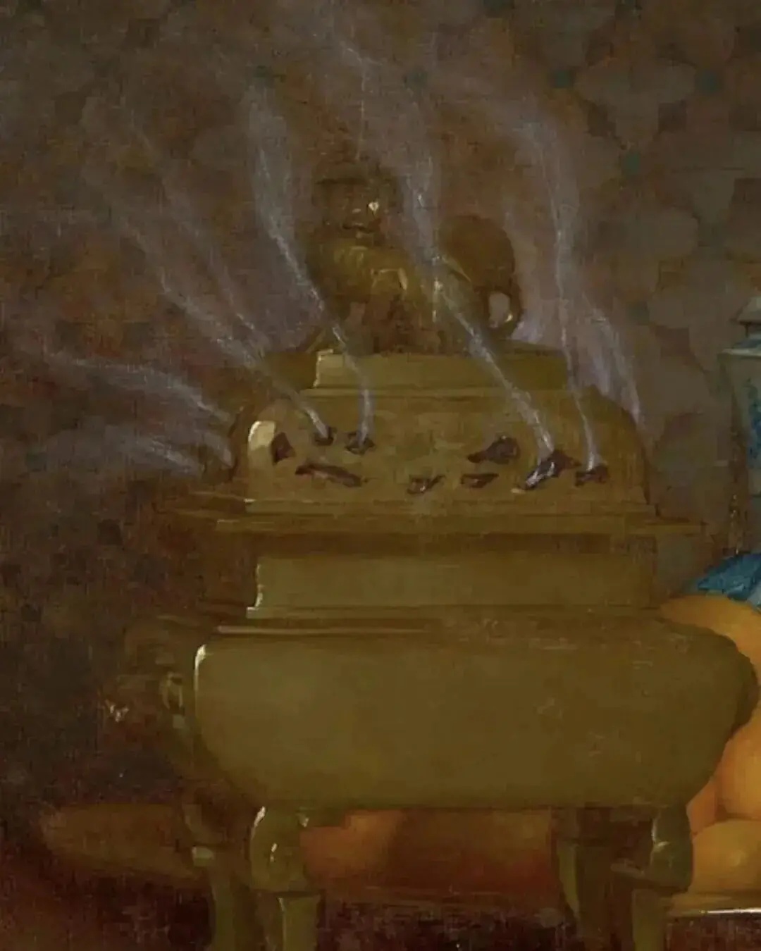 画面中还藏有一处极具巧思的小细节,为整体艺术表达增色不少 —— 一尊小巧精致的香炉静静置于旁侧。