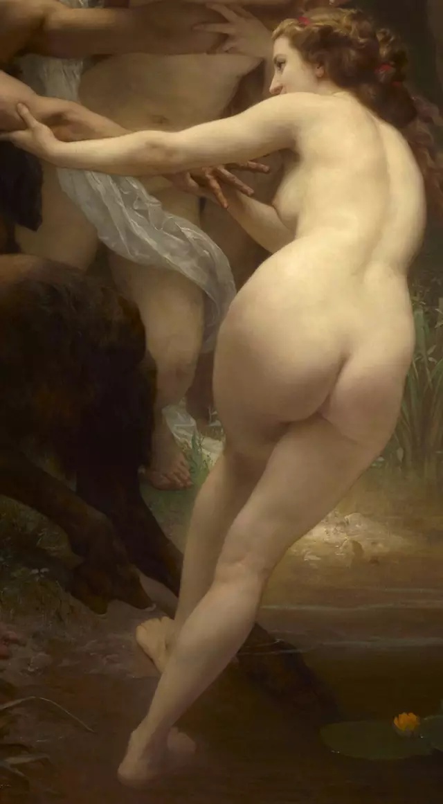 在布格罗所有的人体绘画中,《宁芙与萨堤尔》是一幅极为出众的画作,它运用古典主义造型和浪漫主义欢乐激情表现仙女们发现偷窥她们沐浴的半兽人萨堤尔,然后试图合力把萨堤尔拖入水中一起玩耍的情景。其亮点在这种大胆的布局下且不失韵味。仙女们的顽皮仿佛就像是想拉着自己的父亲去玩耍一样,甚至还有点撒娇的感觉在里面,每个仙女都做了相当鲜明的刻画,表情和动作都栩栩如生,然而却又不失整体感,萨堤尔一改传统绘画中神的庄严形象,显得有些手足无措,却又仿佛很惬意的感觉。这种“对峙姿势”在布格罗的笔下表现出一种凝滞的平静。仙女们不同于以往女性角色惯常的顺从与被动,特别是处于最前面的仙女的姿态设计得如此独特,背部丰腴柔美,线条流畅,匀称和谐,无可挑剔,在十九世纪的艺术中像这样以臀部直接示人的形象是不多见的。