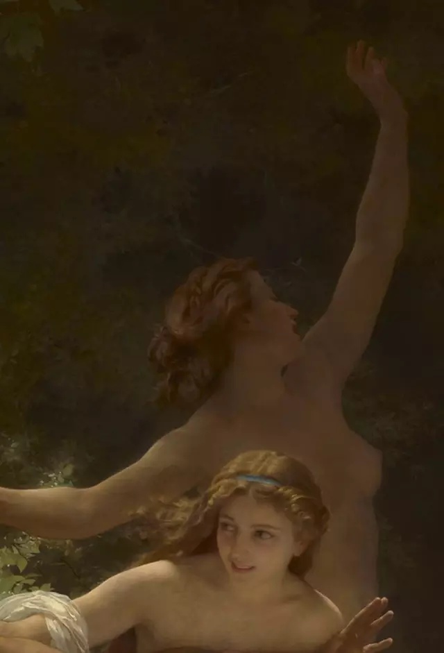 画面的虚实关系通过空气透视来表现,让人感觉似梦非梦。再加上布格罗巧妙地运用绿色来引导这幅画的氛围,绿色是能让人放松的颜色,而让这绿色偏黄并且变暗,使得绿色的成分变淡,使得画面节奏不那么强烈,很容易让人放松下来欣赏这幅作品,并让人越品越有味道。