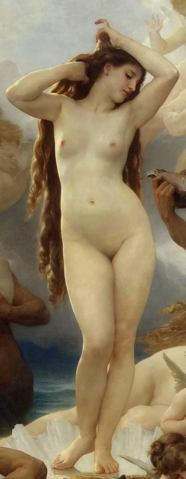 画中描绘的女神从海水中升起,受到众多海神和小爱神的欢呼。画面中的维纳斯刚刚从沉睡中苏醒过来,惺忪未醒的状态显示出一种高贵的圣洁,就像出水的芙蓉,这是布格罗刻画维纳斯形象的独特与高妙之处。