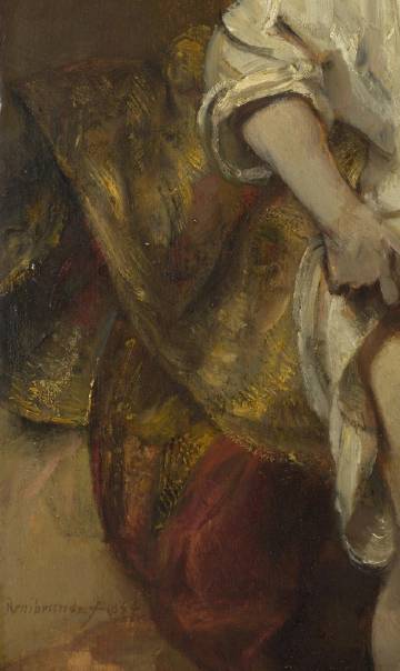 弗兰德斯画派重要的巴洛克艺术家,伦勃朗的生平则充满坎坷,临终前甚至因经营失败而破产。伦勃朗与鲁本斯一样迎娶过两位夫人,他的第二任妻子亨德里克是他原先的女仆,二人的结合充满了坎坷。一方面是由于第一任妻子莎斯基亚去世前留下遗嘱,如若伦勃朗再娶将不能继承其遗产,况且,将女仆迎娶进门,在当时社会被视为通奸一样令人不齿。但亨德里克虽然目不识丁,却以坚韧的性格为伦勃朗打理着落魄的生活,成为他晚年的生活支柱。《亨德里克在河中洗浴》是一件充满爱意的作品,伦勃朗用富有激情的笔触描绘了亨德里克缓慢涉水时的生动倩影。提着连衣裙、蹑手蹑脚地探步下水的亨德里克,显示出女性特有的娇态,既胆怯,又温柔,富有一种自然天成的美感,这些特质都在她毫无修饰的姿态中和低垂的脸上表现出来。画家以粗犷的笔触,充满激情地描绘连衣裙,运用明亮与幽暗交织的色彩描绘环境,尤其是那如镜般的池塘倒影,使这位可爱的荷兰女子生动地展现于观众面前。