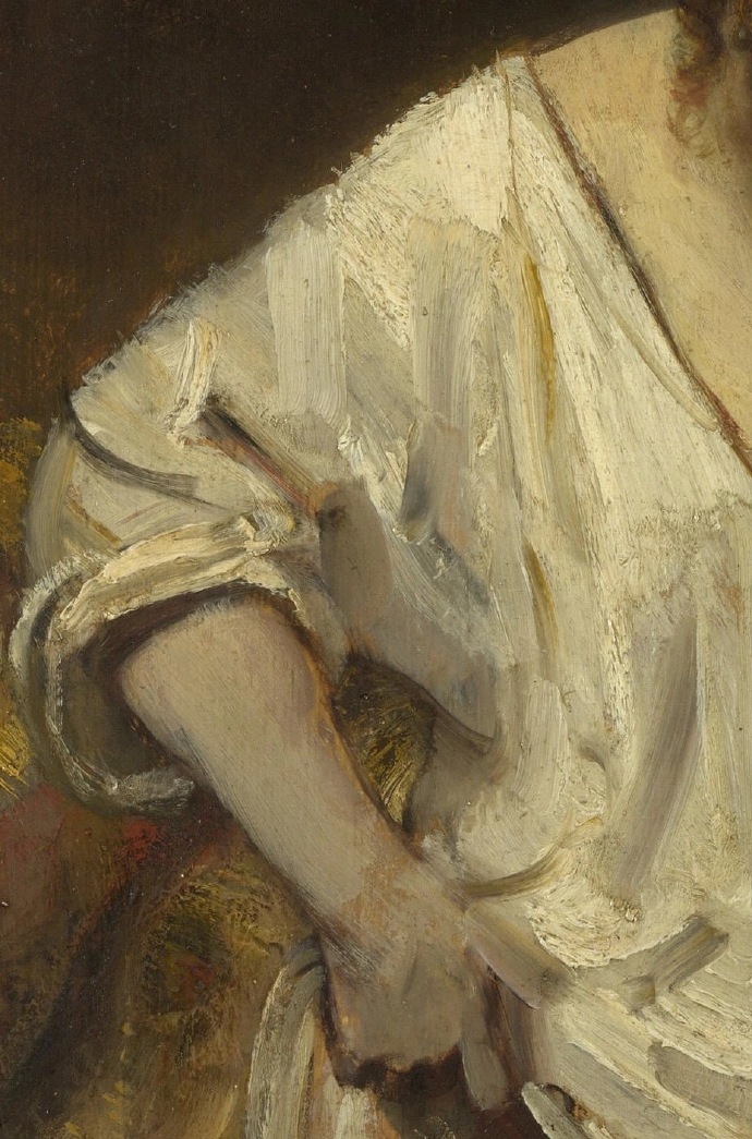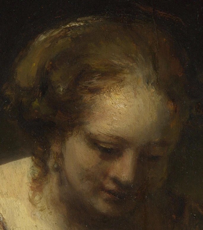 画中模特是亨德里克耶·斯托弗尔斯,原是伦勃朗的管家,后成为他的伴侣。这幅画创作于伦勃朗人生最艰难的阶段——这时他已破产,还饱受舆论指责(因与亨德里克耶的非婚关系),有学者推测,亨德里克耶微微隆起的小腹可能暗示她当时正怀有伦勃朗的孩子(他们的女儿科妮莉亚生于1654年),若如此,这幅画更一封隐秘的情书。