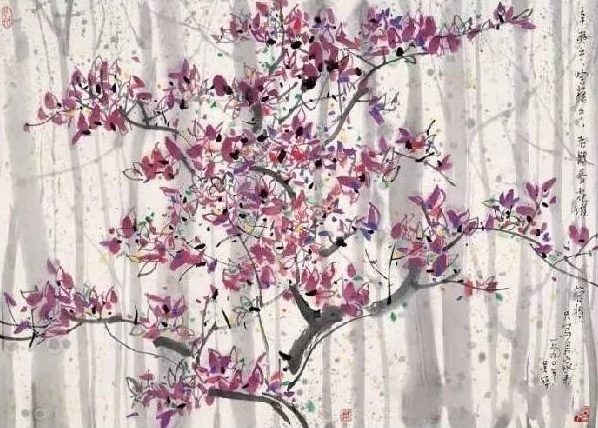 款识:辛夷乎? 紫藤乎? 老眼昏花谁管得,只写自家春色。一九九O年,吴冠中。