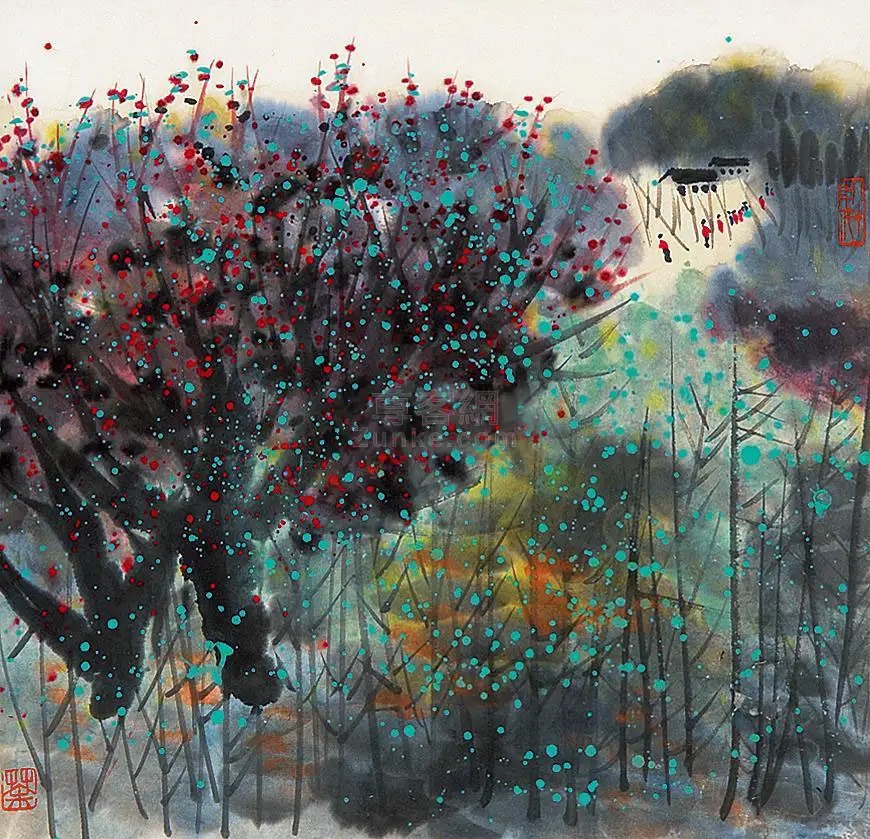 吴冠中 1990年作 《自家春色》--- 该作以中国画特有淡墨营造了树影婆娑背景,然后采用匀、抹、点、挑等多种技法,组合穿插充分强调墨与色的精妙构合,从而生动表现了夏日里花团锦簇的灿烂与妩媚。