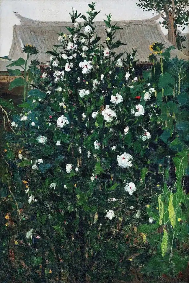 吴冠中 名作《木槿》--- 《木槿》创作于画家盛年1975年。作品描绘了吴冠中旧居的北京会贤堂大杂院景色。《木槿》正是自传中提到的那件作品,里面蕴含了吴冠中对自然与人的关系问题的思考。画面中郁郁葱葱的木槿花铅华洗尽,只有点点绿叶映衬着素雅的小花、显得温馨静谧。