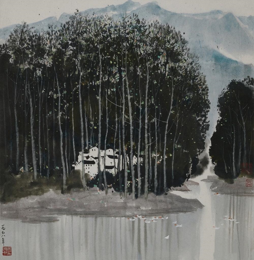 吴冠中 作品《湖畔》。吴冠中的画作具有强烈的个人风格和特色,他认为:“风格不是自己造出来,造出来的都是假的。风格是你自己走自己的路,爬也好,走路也好,向着自己的目标去走,留来的脚印,就是风格。风格是你走在前面,留下来的背影。所以,我从来没考虑风格,只考虑真的感情.