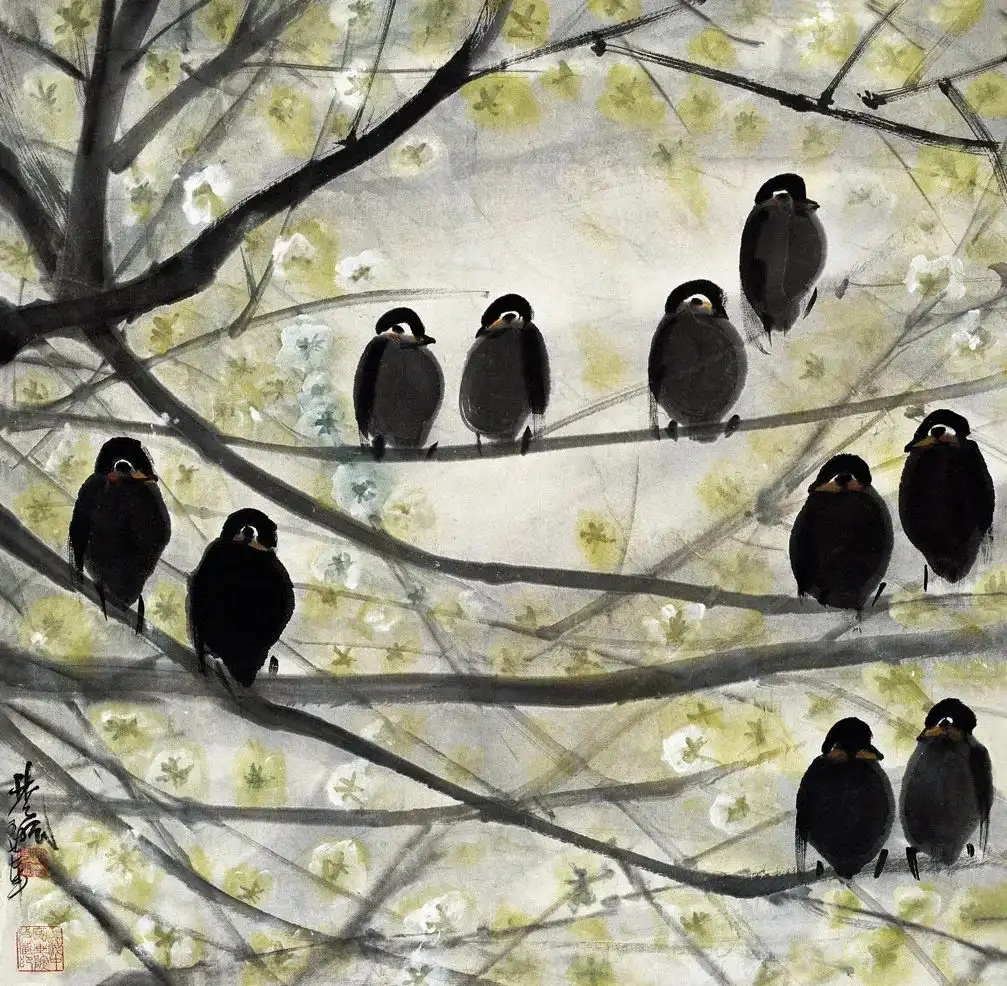 《梨花小鸟》是林风眠作品中典型的方形构图,通过摄影般特写的近景描绘,重显平面构成,弱化纵深表现。画面中十只小鸟分成三排,两两成对,没有主体和中心。他用相近的笔法描绘了枝干、梨花,雀鸟姿态相似,并没有对眼、爪、羽、翅的细致描绘,只有头部向左右略有区别。作品主体的形、态、色等方面的相似性,为画面带来了秩序感和节奏感,在多样统一中,呈现出单纯、明朗、突出的艺术风格。作品通过黑白的对比营造出沉郁孤寂的意境,却又不一味的消沉或顾影自怜。仿佛在感伤中又蕴涵着勃发的生命力和无限的希望。