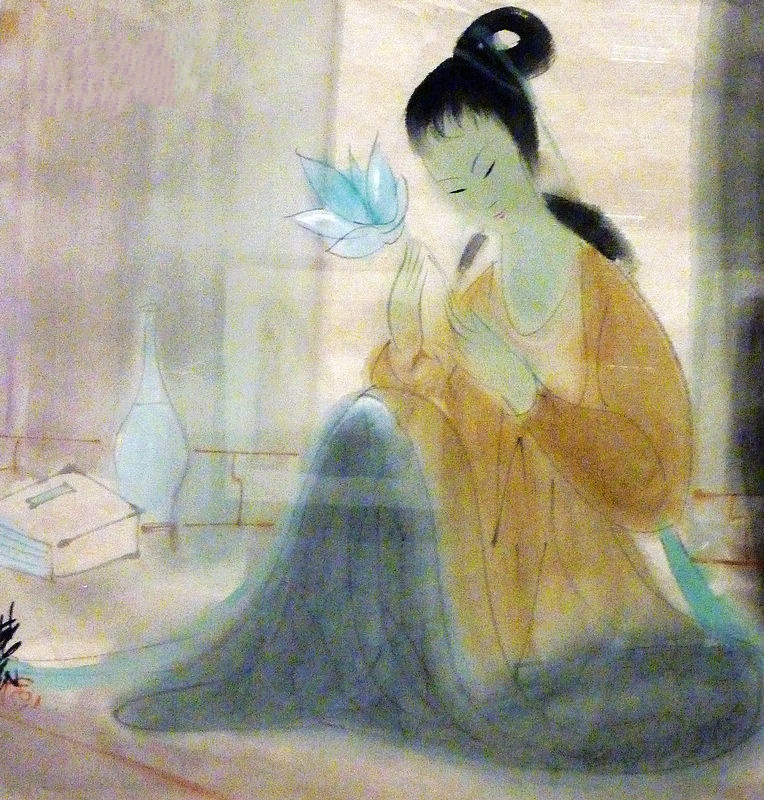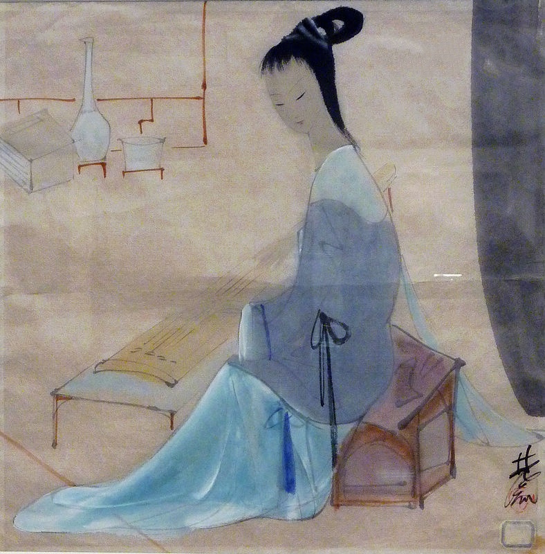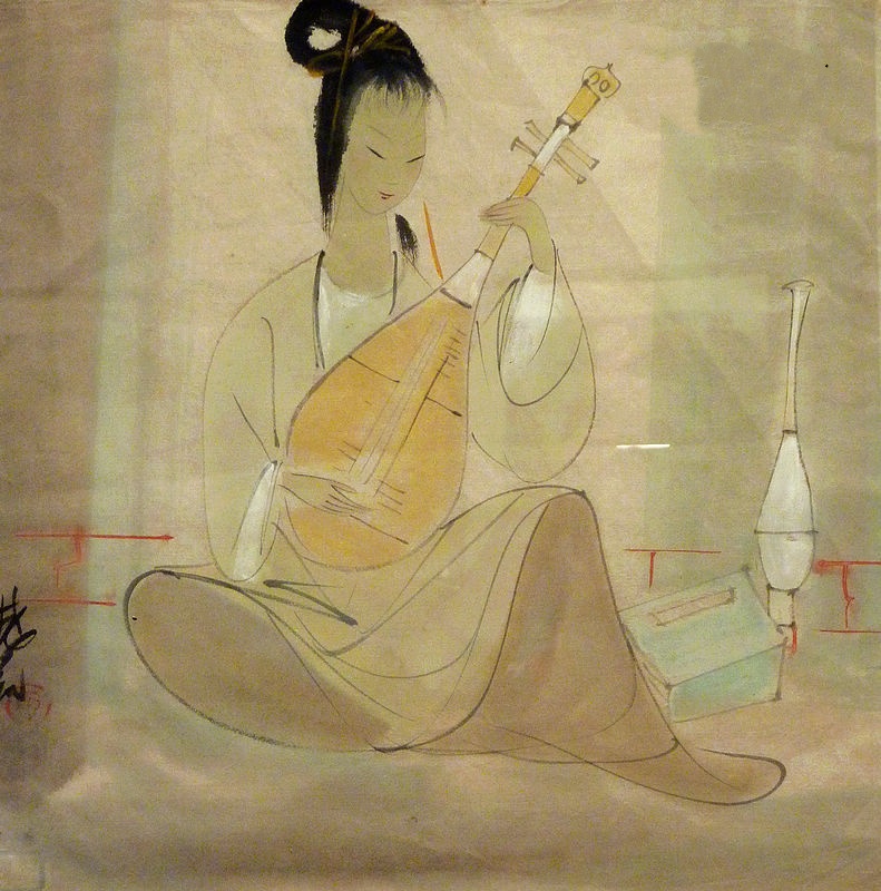 6、纸本水墨设色《弹琴仕女》1950年代 作者:林风眠 上海美术馆藏