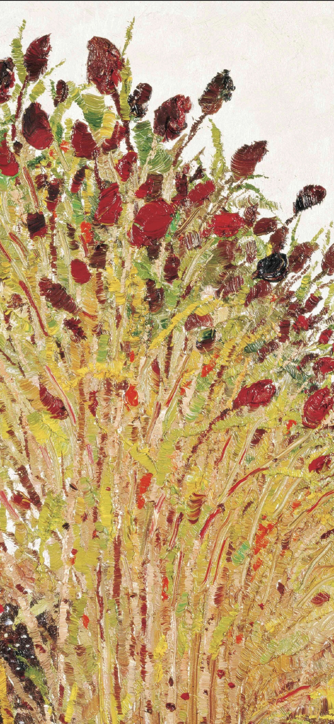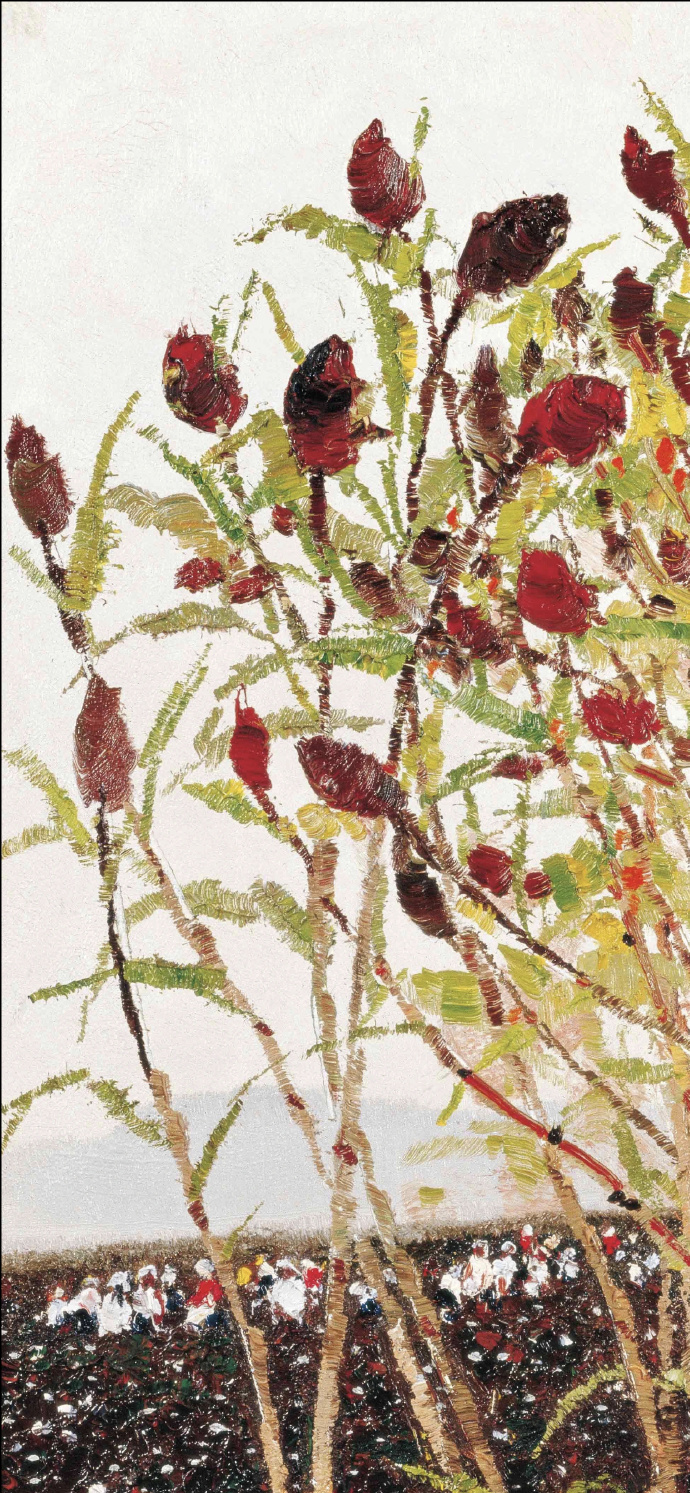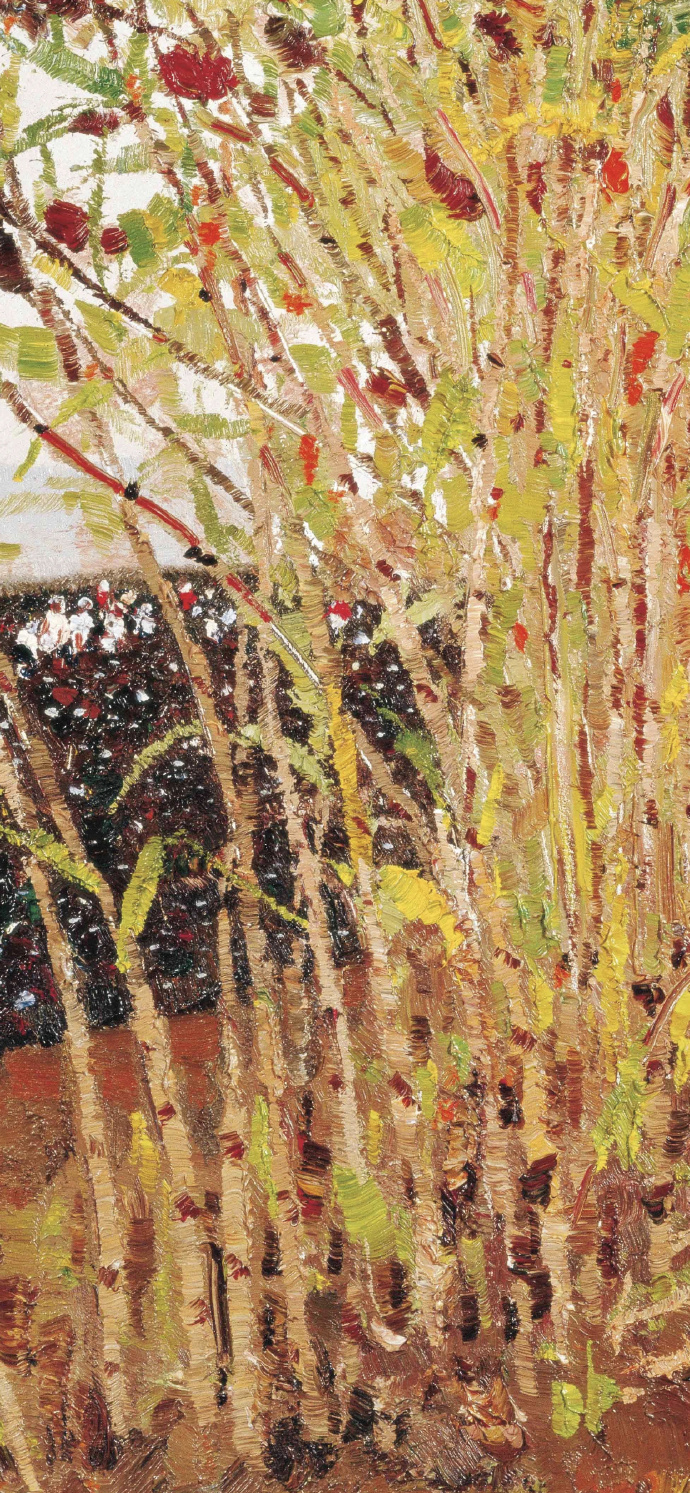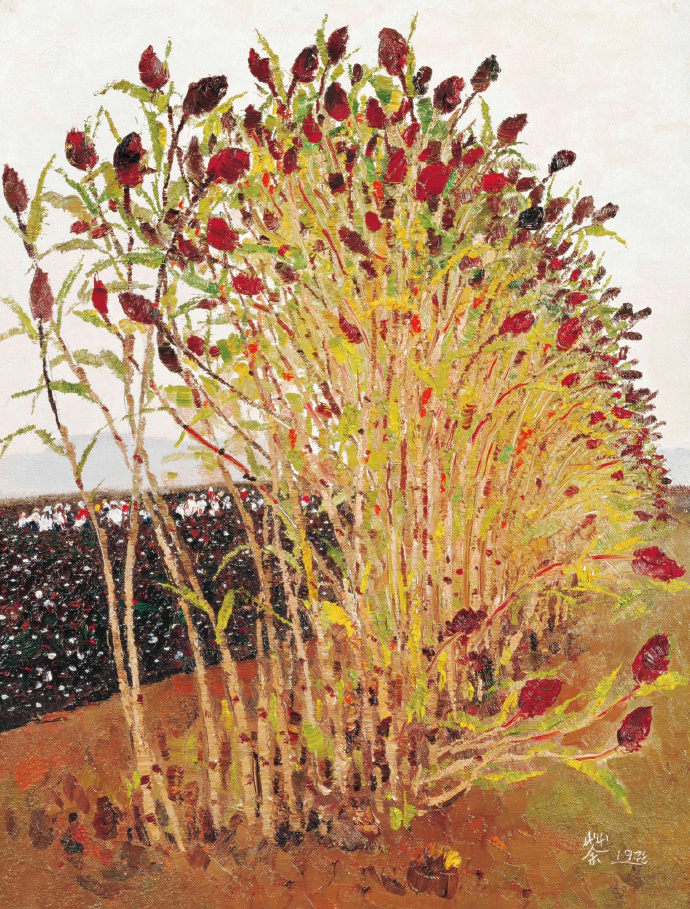 1972年,吴冠中先生作了油画《高粱与棉花》,同年,他还作了《胡萝卜花》、《瓜藤》、《丝瓜》和又一幅《瓜藤》及又一幅《高粱》,仿佛意犹未尽,20多年之后的1995年,他又作了一幅《青高粱》,均为油画。从木板、纸板到麻布,用不同材质,反反复复描绘这些人们司空见惯的农作物,表明他有深浓的稼穑情怀。