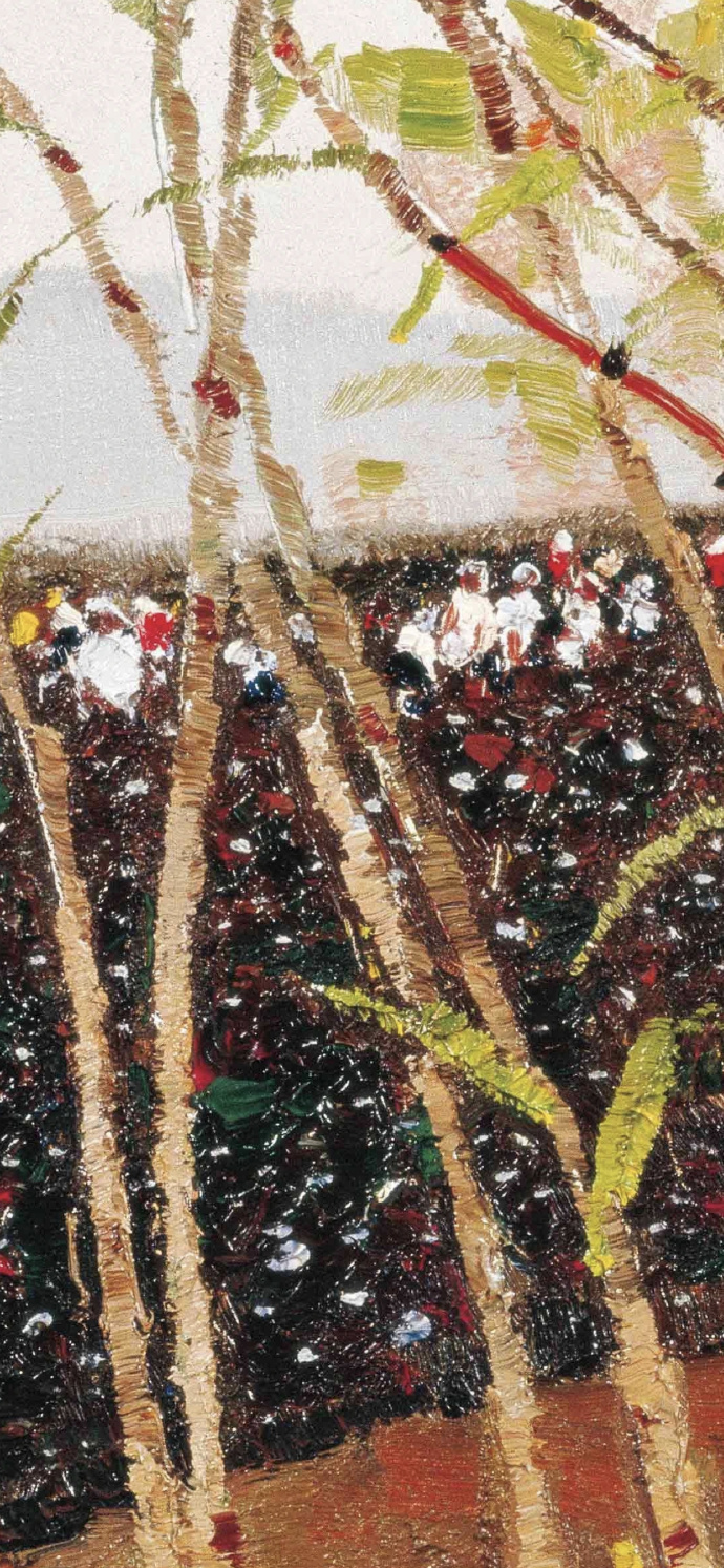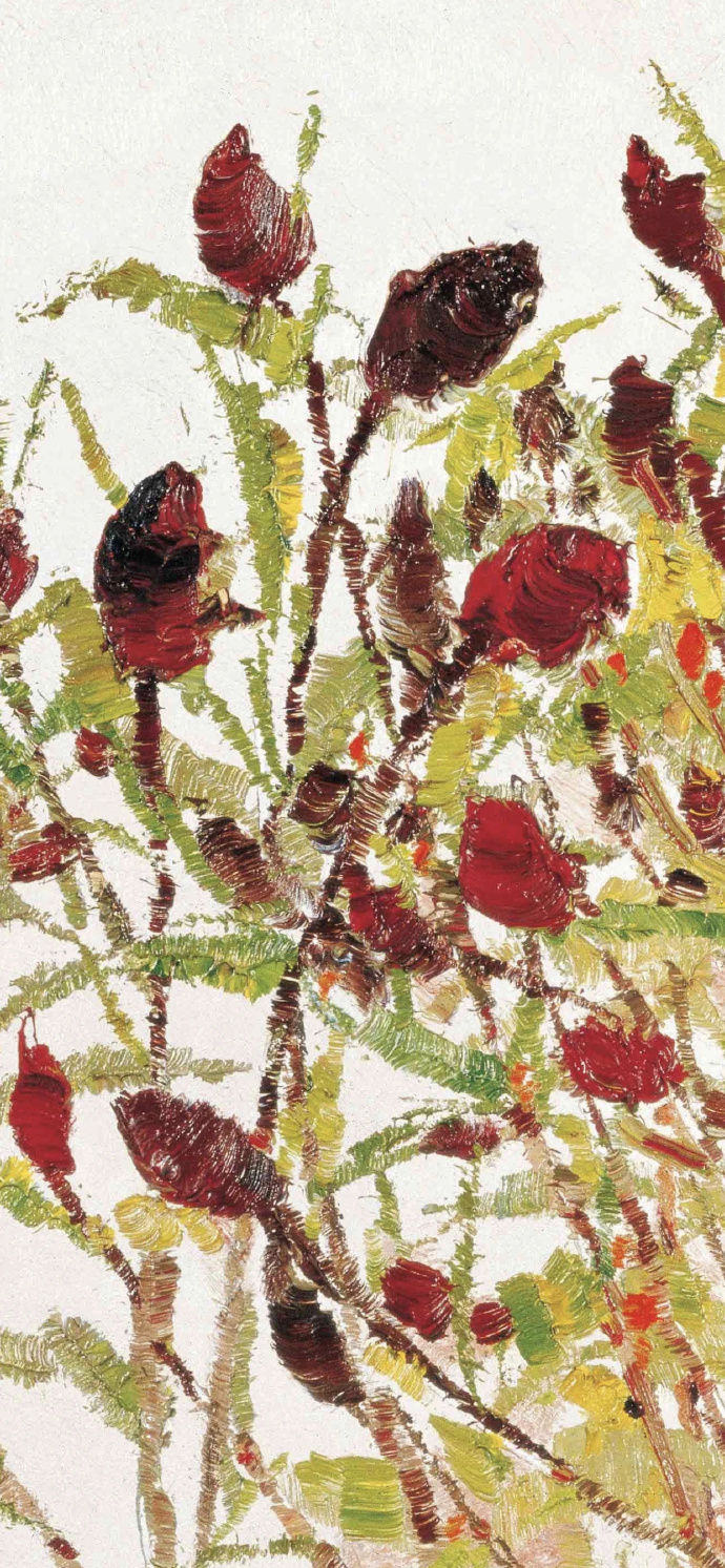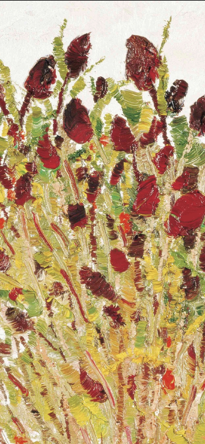 1972年,吴冠中先生作了油画《高粱与棉花》,同年,他还作了《胡萝卜花》、《瓜藤》、《丝瓜》和又一幅《瓜藤》及又一幅《高粱》,仿佛意犹未尽,20多年之后的1995年,他又作了一幅《青高粱》,均为油画。从木板、纸板到麻布,用不同材质,反反复复描绘这些人们司空见惯的农作物,表明他有深浓的稼穑情怀。