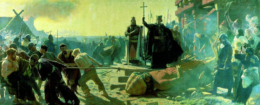 《在吕根岛Arkona要塞,主教阿布沙龙推倒Svantevit的神像》(Bishop Absalon topples the god Svantevit at Arkona),作者Laurits Tuxen(1853-1927)是丹麦画家和雕塑家。吕根岛(Rugen)是德国最大的岛屿,当时是反抗丹麦的德国温德人(Wends)的主要战略要塞,也是温德人祭奠他们的神明Svantevit的圣殿所在地。
