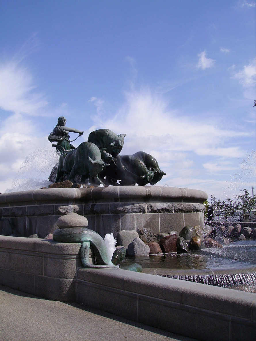 《葛冯喷泉》(Gefion Fountain),位于哥本哈根港附近的一个大型群雕,作者Anders Bundgard。葛冯(Gefion)是北欧神话中的丰收女神。这个“动物群雕”的主体是一群耕牛。