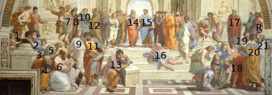 《雅典学院》中,拉斐尔把不同时期的人全都集中在一个空间,古希腊罗马和当代意大利的50多位哲学家艺术家科学家荟萃一堂,拉斐尔以柏拉图和亚里士多德(他把柏拉图绘成达芬奇的脸,以表达对达芬奇的敬重)两个希腊哲学巨匠为中心,向两翼和前景展开,彷佛正在“表演”一场宏贯古今的古希腊思想史,唯心论和唯物论之争。