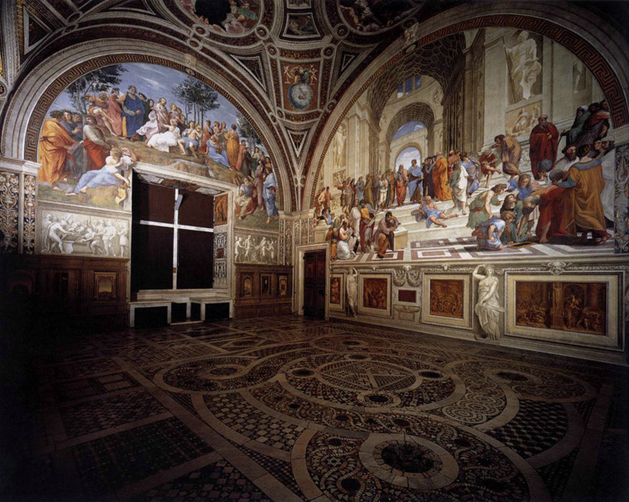 《雅典学院》的原图,在梵蒂冈的“拉斐尔画室”或曰“拉斐尔展室”,如下所示(这几间房子原来是教皇的办公室和私人图书馆,聘请拉斐尔创作了一批大型绘画后,被改称为拉斐尔展室)。