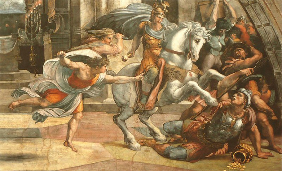 《奥斯提亚战役》(Ostia)。拉丁文Ostia的意思是“嘴巴”,这座港口城市位于台伯河(Tiber)的入海口。作品描述教皇利奥四世(Pope Saint Leo IV)的军队在这里战胜阿拉伯人的一次战役:教皇号召组织了五处罗马的联军,击败了乘船前来台伯河的河口,打算抢掠罗马的阿拉伯海盗。