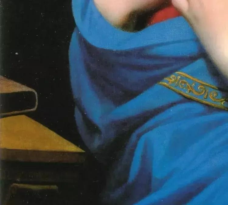 这幅画作是应收藏家罗兰-戈瑟兰的委托而创作的。画面中的圣母身着象征神圣的蓝色衣裙,显得温柔和蔼。桌子上摆放着一本书和一束百合花,象征着纯洁与智慧。安格尔采用了纯净的线条和色彩,塑造了安静圣母的经典形象。与文艺复兴时期典型的正面姿势不同,安格尔让圣母微微侧身,头部轻轻转动,使得人物形象更加理想化和神圣化,与象征纯洁的百合花交相辉映。
