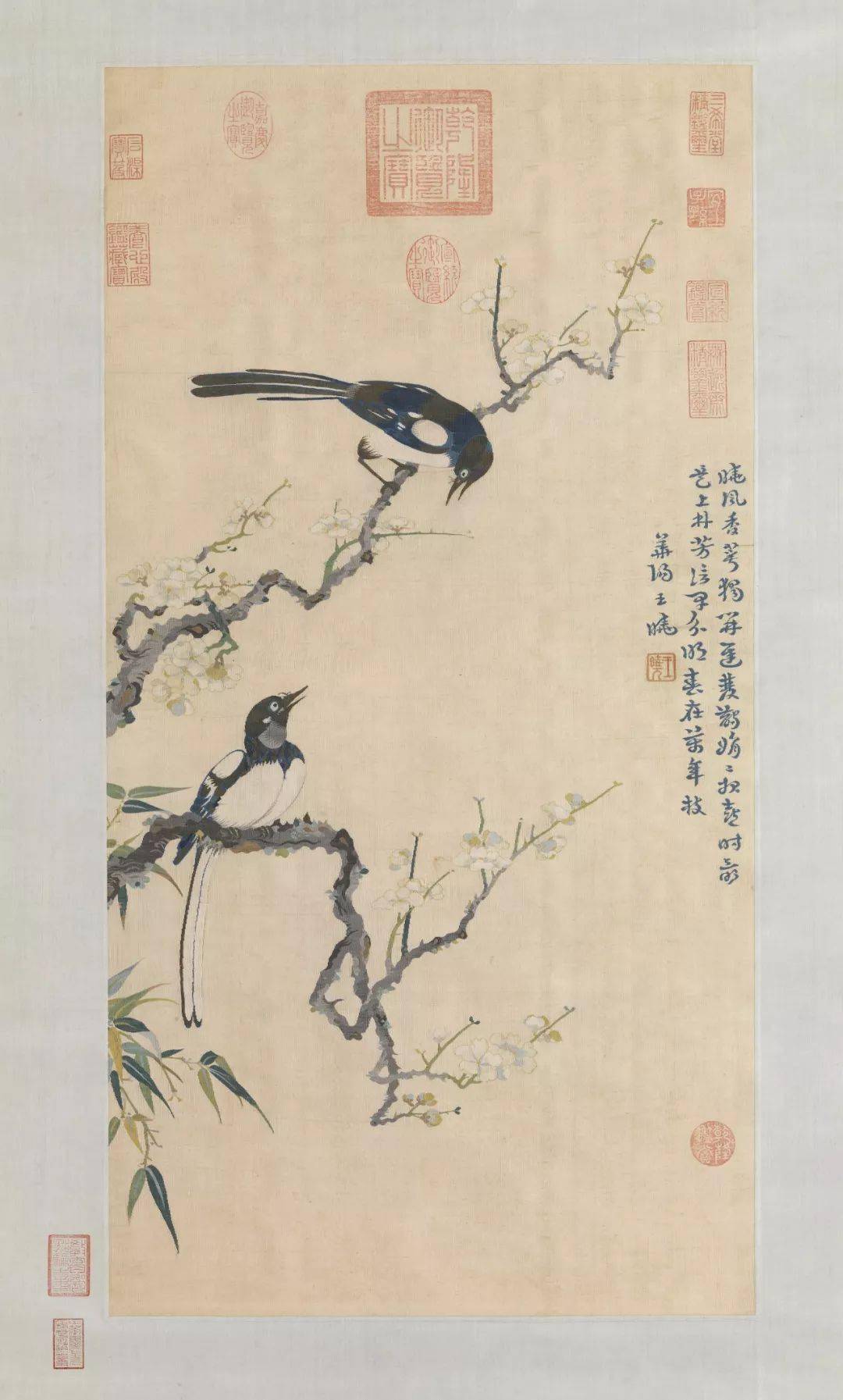 此幅设色清雅,技巧稳健。喜鹊姿态写实传神,而梅干之弯曲与梅花之结组自然富有生意,构图疏朗,典雅明快。
