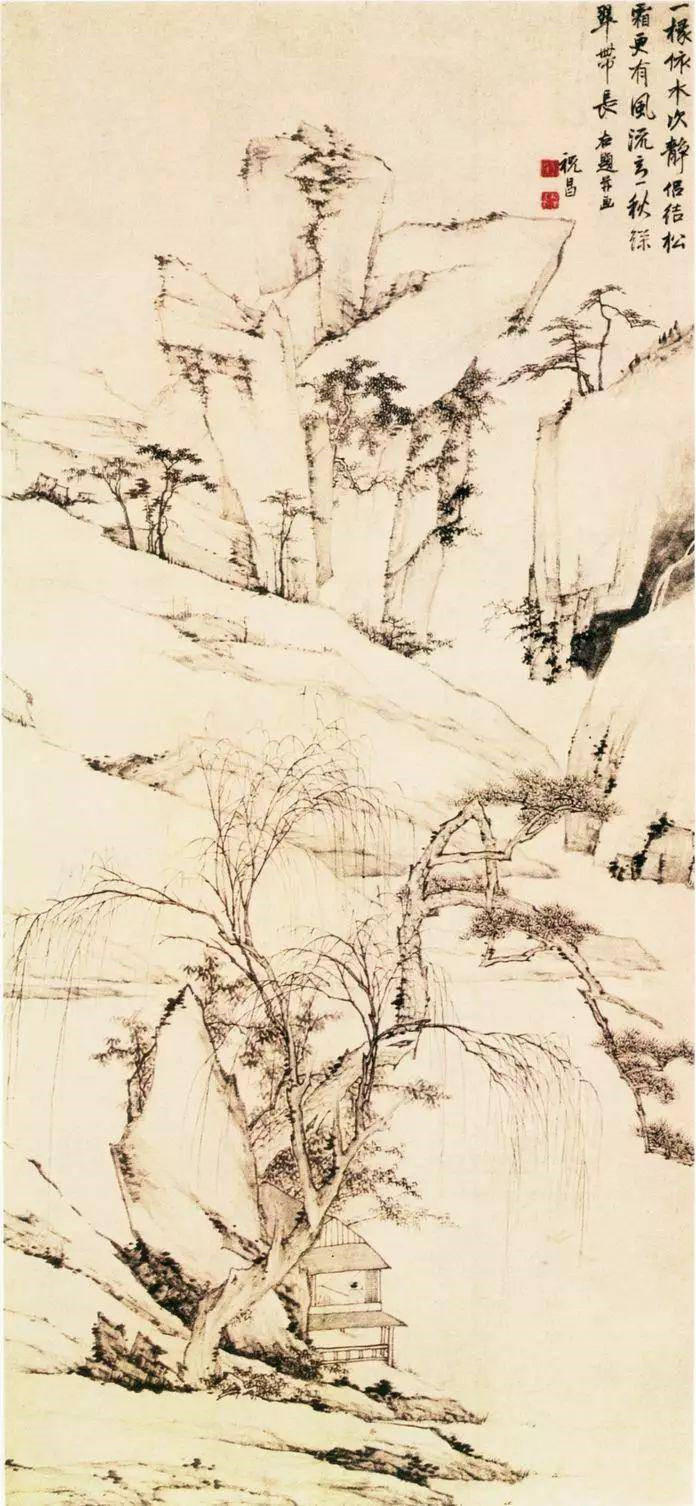 《水阁深秋图》是清代画家祝昌的作品,又名《清祝昌水阁深秋图》。画中近处坡坨平迤,巨石矗立,柳树枝条舒展,古松倒垂,临溪筑水阁,一人凭栏远眺,景极清幽。右上自题:“一椽依木次,静侣结松霜。更有风流亭,秋深翠带衣。”