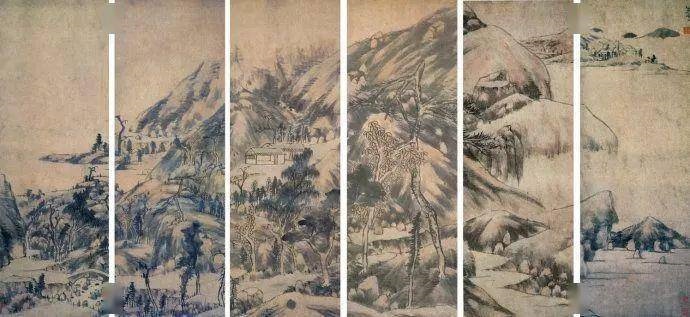 此图从左向右展开,图一、二为序幕,图三、四为高潮,图五、六为尾声。从一至六,是一个十分完整的横幅巨作,平均裁为六等份,便成六幅屏条,每一屏条又自成一个局面。六个屏条,内容依次为 :平波野桥、山环路转、晴岚山居、苍松红树、山阴夕照、山村平远。