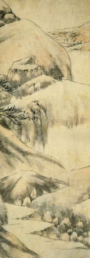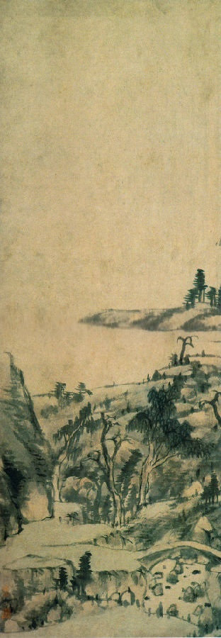 图三初入高潮,高处晴岚飘拂,整个地遮蔽了山头。这是古画中少见的取景之法。前人画云,多截断山腰,而八大山人在此整个地略去山头,又另有一番虚无缥缈之状现出,恍若仙境。再往下,山腰有一平坡,两栋茅舍。到此可见,山路野桥果然是曲径通幽。茅舍之前,树木郁郁葱葱,苍翠欲滴,正所谓“山不在高,有仙则灵”,又恰合了所谓“云多不计山深浅,地僻绝无人往来”。这又正是中国古代失意文人向往的理想境界。画面到此,可说是洋溢着深邃高雅的人文精神,飘拂着无比的仙灵之气。然而,这还不是画面的最高潮。