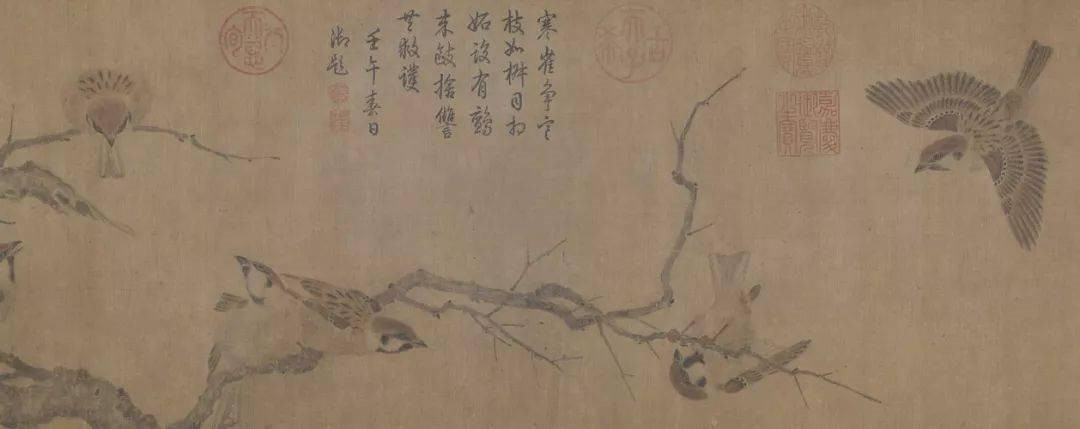 《寒雀图》上有乾隆皇帝御题诗:“寒雀争寒枝,如椒目相妒,设有鹯来驱,舍仇共救护。”这首诗描绘了麻雀在寒冬中争夺枯树枝的情景,麻雀之间虽有争斗,但当面临外敌(如猛禽)威胁时,它们会放下内部矛盾,共同抵御外敌。