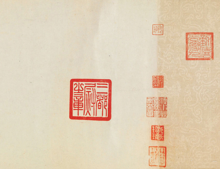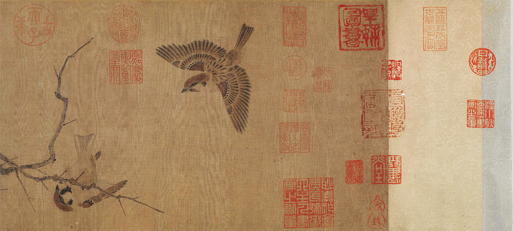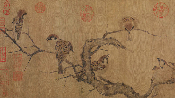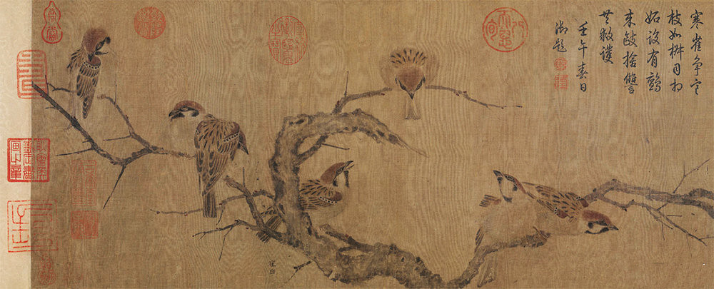 九只麻雀集于一图,八只栖于枝上,或正或侧,或俯或仰,或相互依偎,或相互顾盼,更有一只自远处飞来,使画面又别生动感。九只再普通不过的小鸟,一经入画,是如此鲜活灵动,可鉴其情,似闻其声,充满了诗情画意,于质朴中昭示淳美,引领一股旷野清风,一扫宫廷画苑的靡丽柔弱之习。左起第四只麻雀尾下有“崔白”款识。