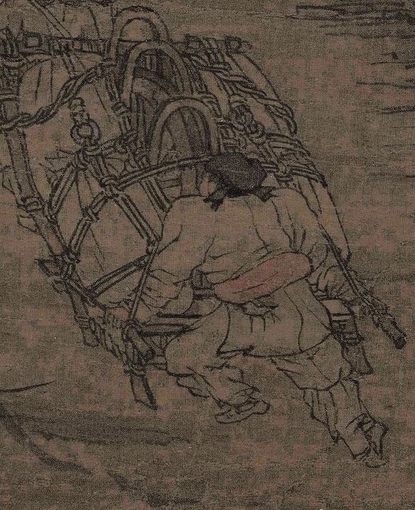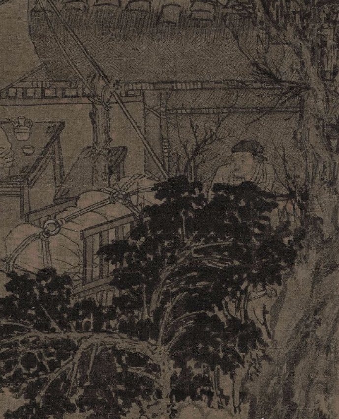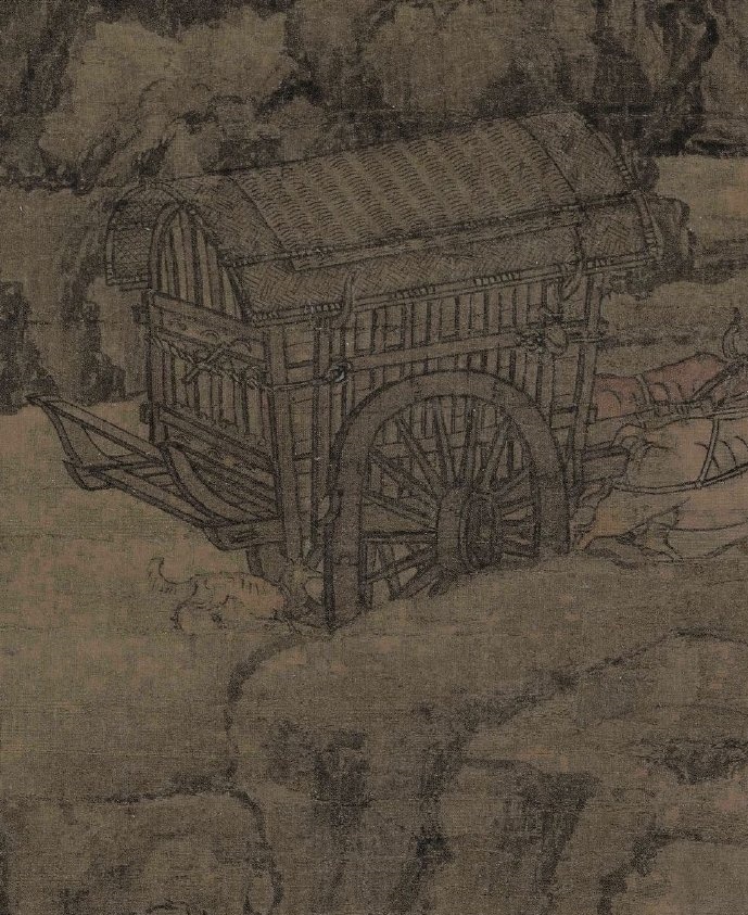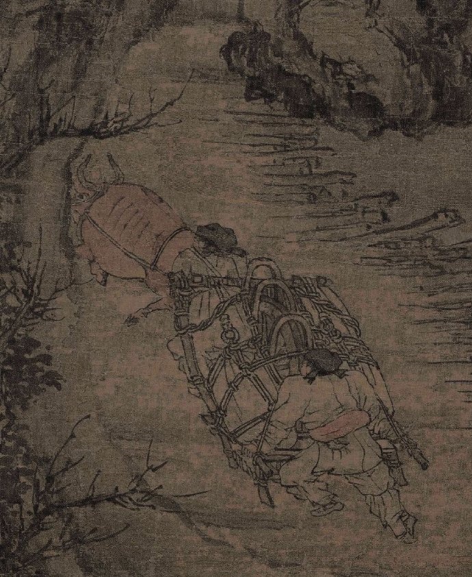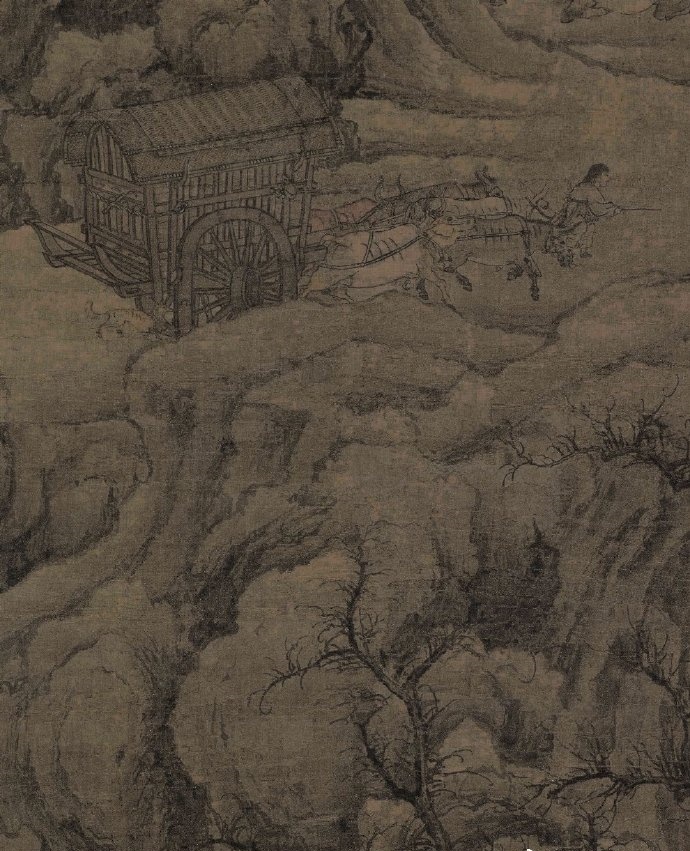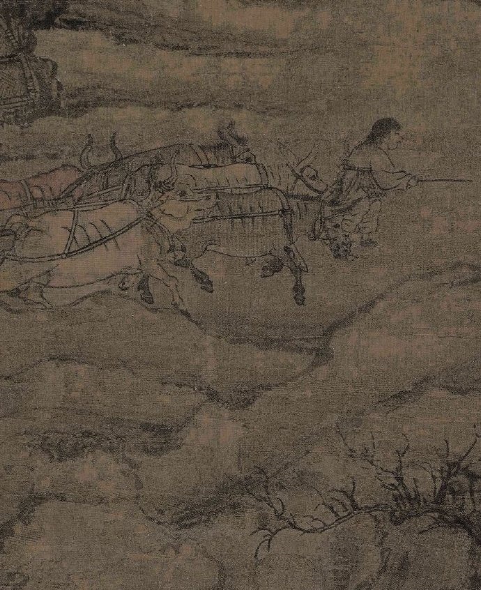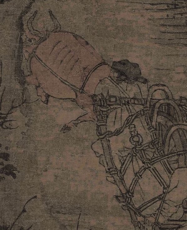 此图描绘盘曲艰险的山间栈道上,脚夫们赶着黄牛驾车艰难地向山上行进,装满货物的牛车车架已压得有些变形。一只小狗出现在车轮旁,一边高声呼叫着通知客人的到来,一边左右奔跑,似欲助牛车一臂之力。向屋后眺望,林木尽头是无数的山峦烟岫。图中以苍浑粗括的笔墨勾勒山峰树石,风格沉郁,山石的画法受郭熙的影响,是宋人无款画中的杰作。
