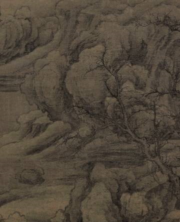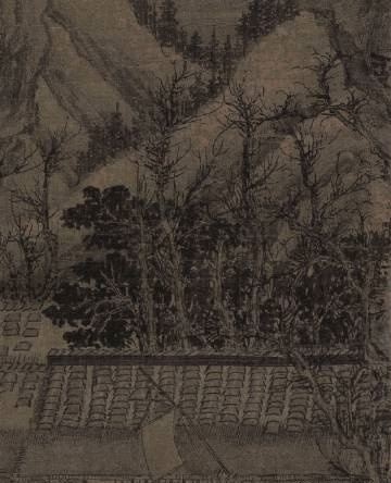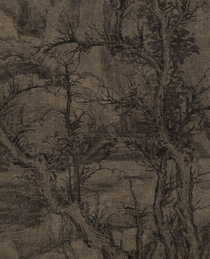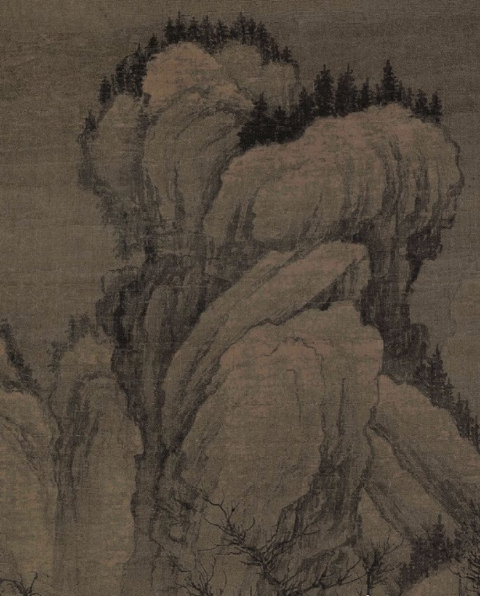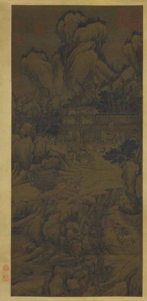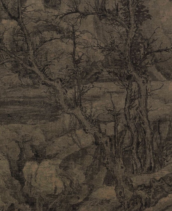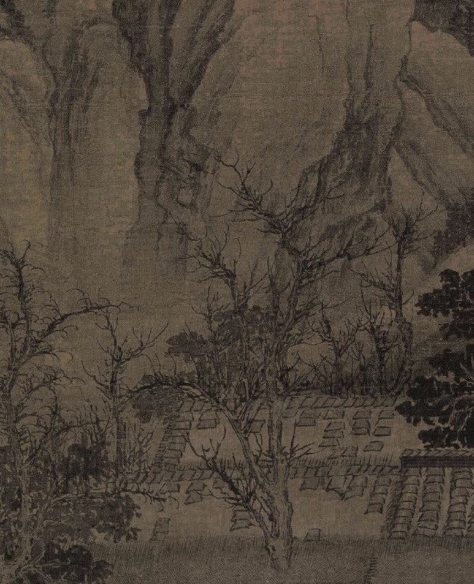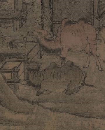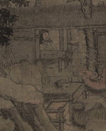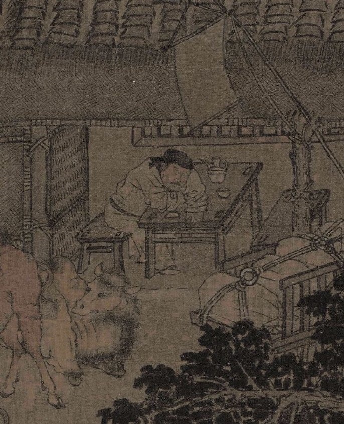 此图描绘盘曲艰险的山间栈道上,脚夫们赶着黄牛驾车艰难地向山上行进,装满货物的牛车车架已压得有些变形。一只小狗出现在车轮旁,一边高声呼叫着通知客人的到来,一边左右奔跑,似欲助牛车一臂之力。向屋后眺望,林木尽头是无数的山峦烟岫。图中以苍浑粗括的笔墨勾勒山峰树石,风格沉郁,山石的画法受郭熙的影响,是宋人无款画中的杰作。