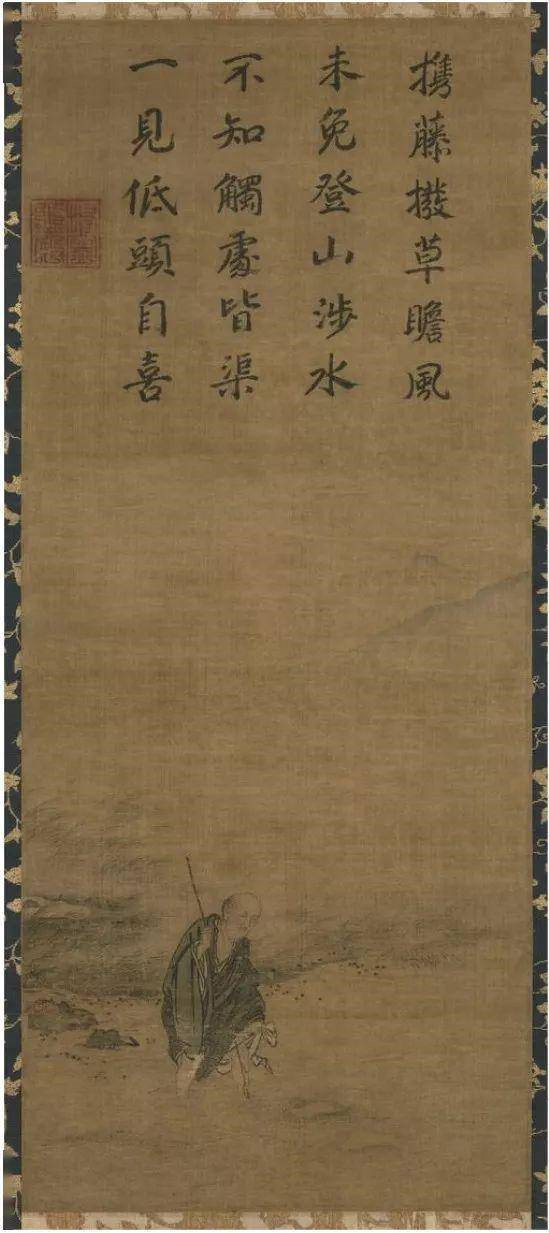 图绘一和尚一手拄棍,一手挽长袍渡水前行。和尚双眉紧锁,表情严肃,浓墨粗线条勾勒衣袍褶皱,密而不杂。画上有南宋皇后杨妹子题诗一首:携藤拔草胆风,未免登山涉水,不知触处皆渠,一见低头自喜。