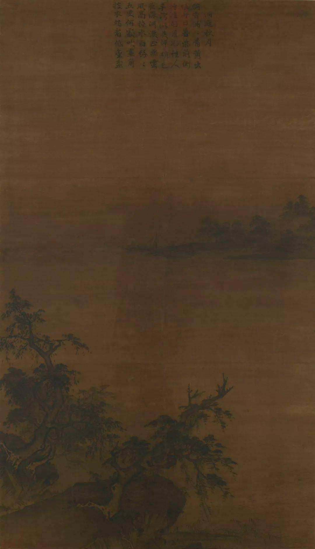 画面描绘洞庭湖秋季夜晚景色,橘香、浦浦、青黄交织,月如佳人,夜深河汉无云,风高水白,五更画角悠扬,极富诗意。墨色苍润,笔法坚挺峭秀,展现了夏圭高超的绘画技艺和独特的艺术风格。