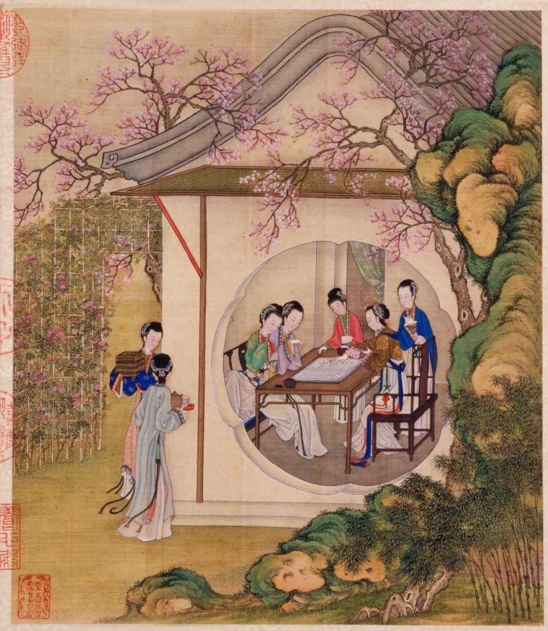 《月曼清游图》册描绘的是宫廷嫔妃们一年12个月的深宫生活,本图为三月“闲亭对弈”。