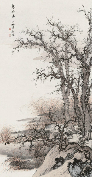 寒林为北方平原的产物,主旨在表现“荒寒萧瑟,烟芜凄恻之情”,宋代李成、范宽、郭熙皆以此题材作过画。本幅以平远的景致为主,章法近似李成的《寒林平野图》,右侧几棵高耸的枯木几乎占据画面大半,左侧为开阔的水域、坡岸,松石幽深,波平如镜,烟岚飘忽游动于山林中,虚实相映。右侧坡岸上数棵巨松,或直或欹,或疏或密,姿态各异。画家用笔灵活,勾画树干、皴树皮、点叶皆用细笔,虽劲拔挺健,然仍具一股娟秀气息;树干上勾圈出很多木瘿;枝桠作蟹爪状,若龙蛇四面分张,苍劲遒逸。整体勾皴兼用,刻画细腻,以充满力度的曲线和皴笔表现出树木之苍老虬曲之态。坡岸以较淡的墨笔勾勒,略加皴笔,并以淡赭石色染之,具有干湿浓淡的效果,几块从土质坡岸上突兀而出的硬质石块以重墨勾勒,干笔皴擦,石青染色,在画面中形成冷暖对比。左侧水域以大片留白呈现,河岸以淡墨和淡赭石色渲染而出。岸上杂草丛生,分别以水墨和赭石写出,线条细劲,描绘出了杂草的层次感,虽在深秋,态貌枯黄,但杂草依然十分具有生命力。整幅画用笔劲健、精练,笔法生动多变,用墨清润秀雅,气格幽静清旷而又浑厚,深得李郭画派的笔意。此画虽无年款,但从寓柔于刚的清劲画风来看,乃画家盛年佳作。