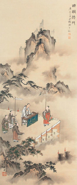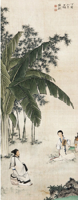 题识:宋嘉祐八年冬,京师有道人游卜于市,莫知其所从来。体貌古怪不与常类,饮酒无算未尝醉,都人异之相与传说,好事者图其状后近侍达帝引见赐酒,一石饮至七升时,司天台奏寿星临帝坐,忽失道人所在,仁宗嘉叹久之。仁宗时天下熙熙,宜乎寿星游戏人间,躬见于帝必有以感而然也。甲申嘉平,少梅陈雲彰。