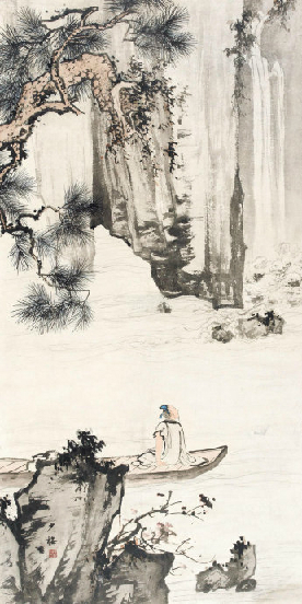 构图分上、下两部分,中间以水纹相隔,笔断却意连。上部危峰耸立,瀑布飞流直下,激起涛涛波水,画松用笔如屈铁,硬劲盘亘的拖枝弯曲伸出,过渡转承,仿佛与画中人含笑呼应,被赋予感情色彩。下部一人踞坐小船上回头视瀑,用白描轻松勾勒出人物的神态,自然准确生动。