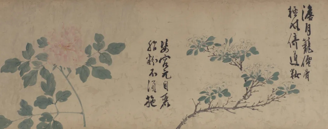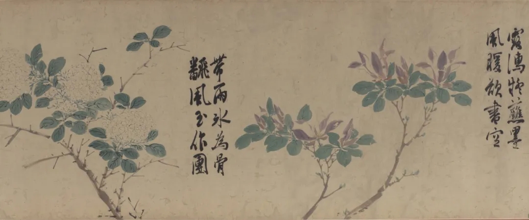 纵观本卷花卉,每一株花卉生长无论向左还是向右斜出,或弯折、或飘动、或点首,所有花卉都朝左(卷尾)舒展之势,犹如一阵东风拂过画面,四时花卉随风摇曳生姿,使得长卷瞬间被注入了气息。这种“布置”使得静态的物象,瞬间有了动态的意趣。总之,无论从纵横、疏密、取舍、参差、动静, 还是一诗一画的独特形式,使画面处处呈现出空灵变化的妙境。