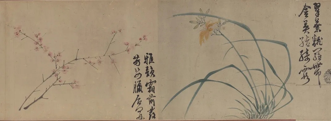 在构图上,陈淳以疏朗之姿,按照时节布局十一种花卉。花卉以“折枝”展现,要么一支独放,要么寥寥数枝,“一花半叶”形简意率,使得画面留下许多“空白”,这种似书法的“留白”营造出明朗的空间感,再以诗文“点缀”作隔,一诗一画,意趣横生。高低错落的诗句,更是打破花卉齐整的高度,使得整体布局疏朗间充满生气。