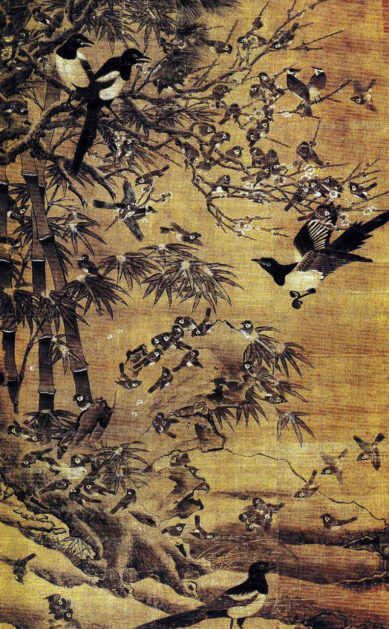 尾羽则破笔丝毛,再染至漆黑,黑而不腻,质感逼真。鹤冠平涂以朱砂,再加以点染。白色背羽,先勾勒其轮廓,再层层分染、积染、罩染,厚实又不失轻盈,幽旷神怡。竹子以赭石色为主,线条谢意粗犷,苍劲有力。