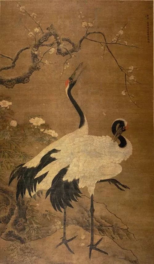 明代著名花鸟画家边景昭的《雪梅双鹤图》将白雪、白梅与单脚站立的白鹤置于同一画面,相映生辉、意趣盎然,造就了一幅妍丽生动、工致绝伦的花鸟画作品,也体现出《诗经》中“鹤鸣于九皋,声闻于野”的境界。The crane has served as a favorite subject for many traditional Chinese arts, frequently bestowed with noble, pure, and elegant connotations in the works of generations of art masters. "Snow Plums and Twin Cranes" by Chinese flower-and-bird painter Bian Jingzhao of the Ming Dynasty combines white snow, white plums and white cranes to wonderful effect, embodying the artistic concept of "cranes singing in the middle of the marsh, with their sound being heard in the wild" from "The Book of Songs" - the oldest existing anthology of Chinese poetry.