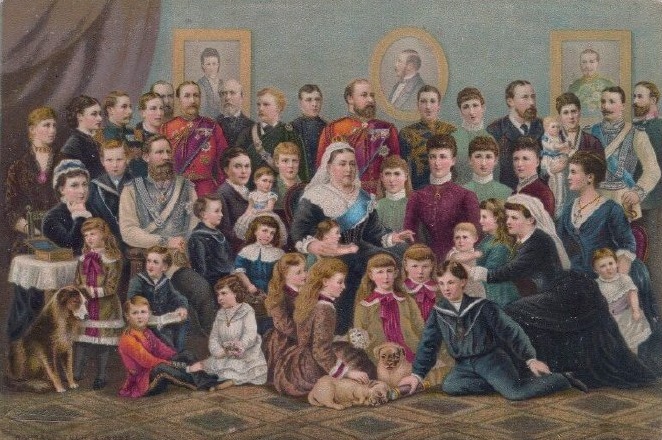 1887年,“欧洲祖母”维多利亚女王和她的子女,孙辈和曾孙辈的合照画像。由于在画像制作前,阿尔伯特亲王、黑森大公夫人爱丽丝,奥尔巴尼公爵利奥波德已经去世,所以三位王室成员的画像挂在墙上以示敬意,画像上的成员并不齐全,有些缺席未到。